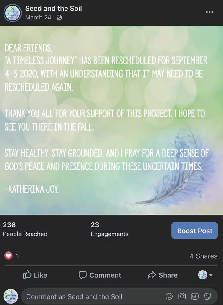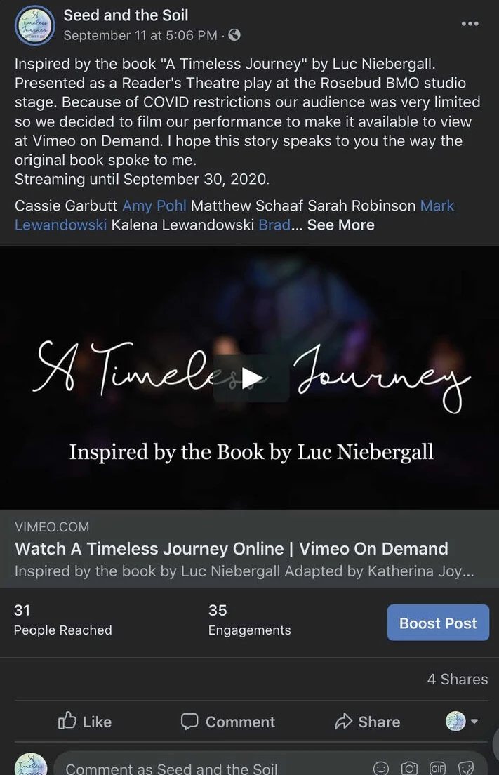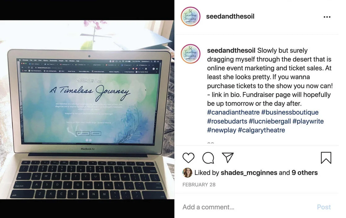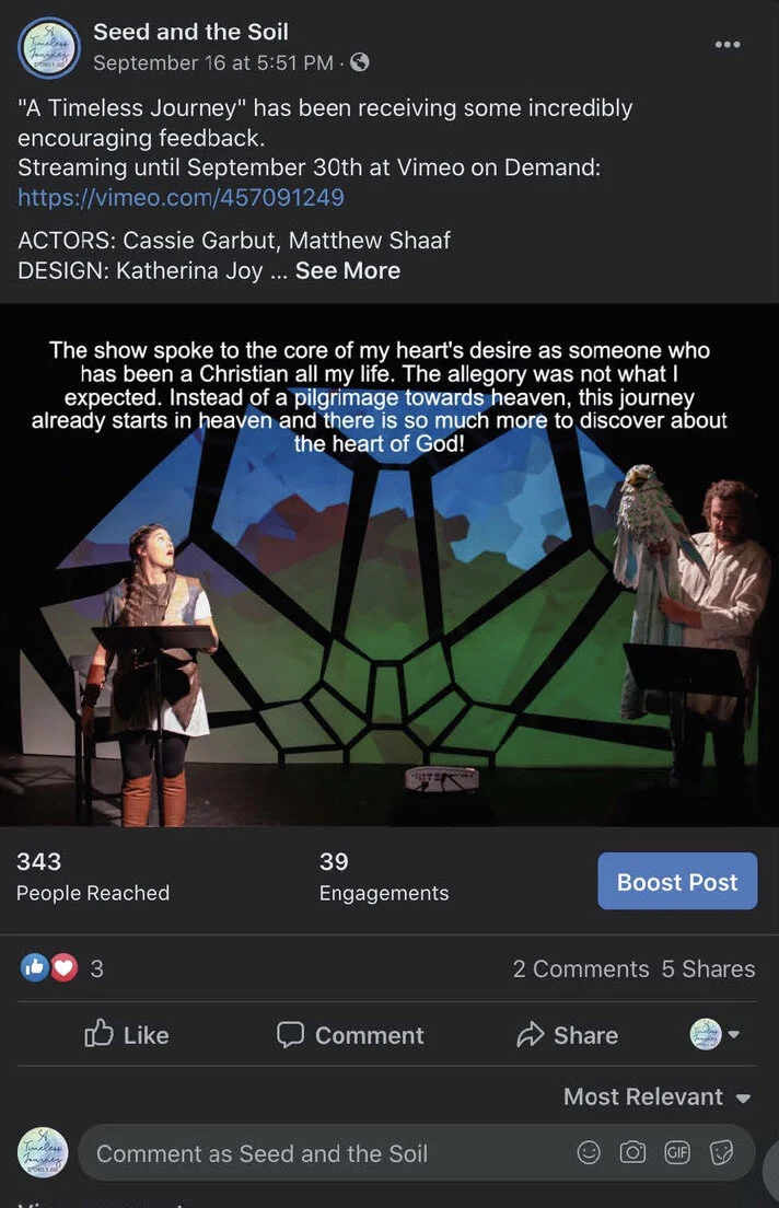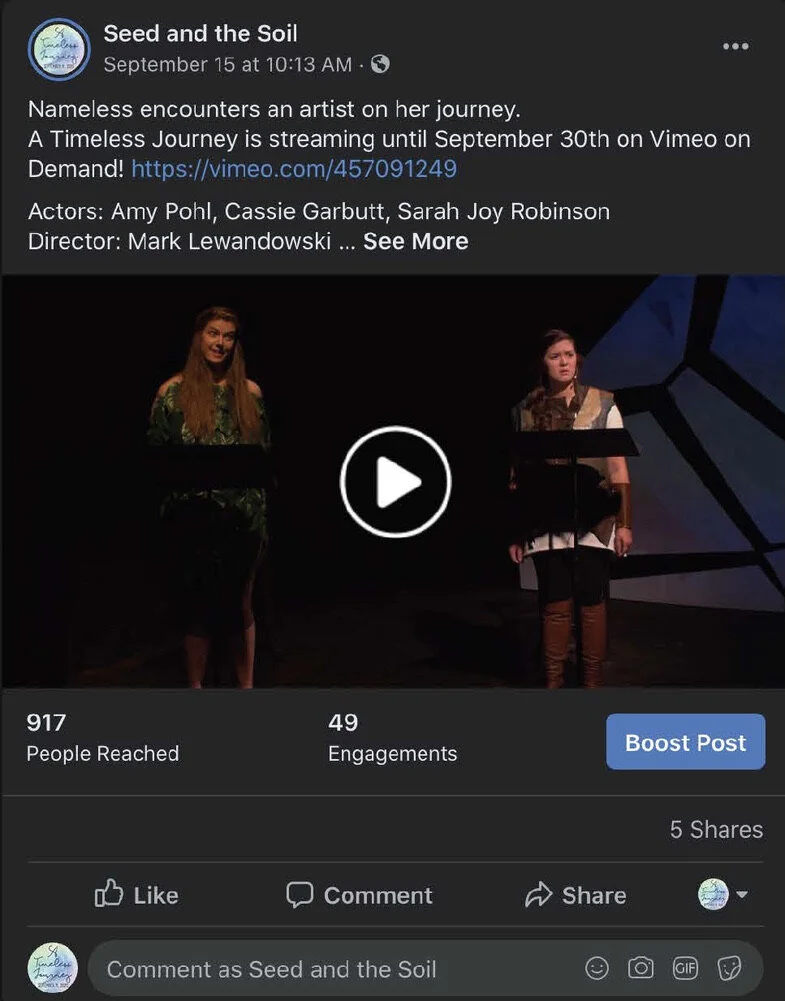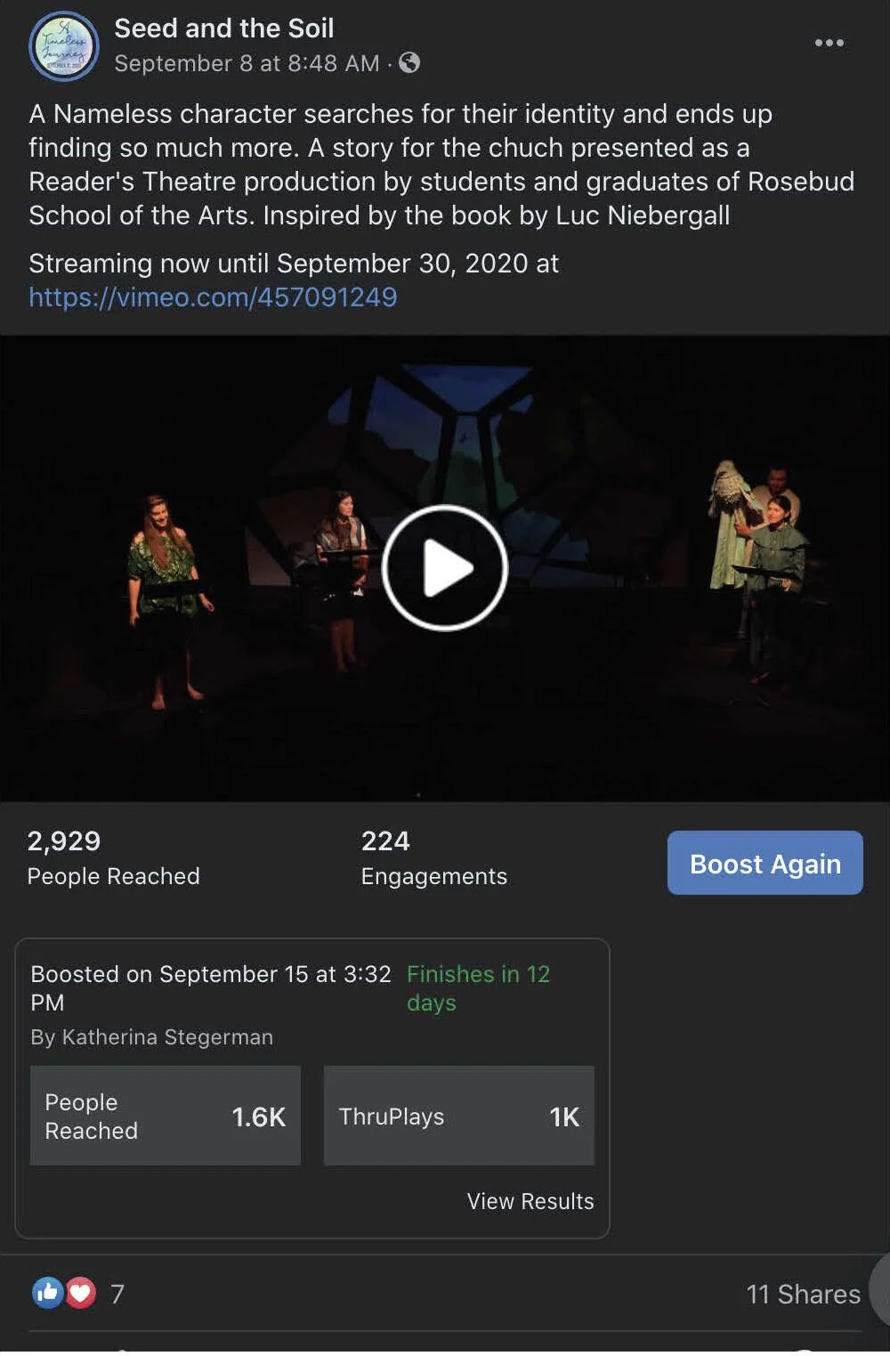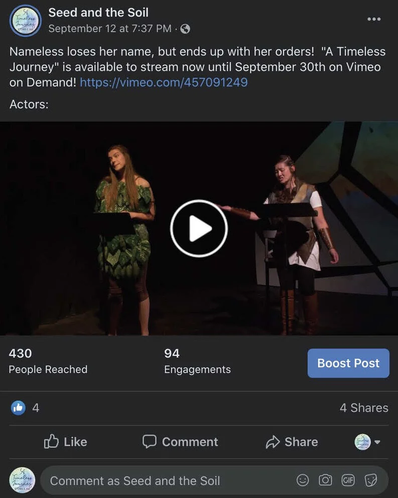 At this point I am unsure if I’ll be able to make budget on this production. I did not meet my fundraising goals and I am unsure if enough people will purchase the stream for me to be profitable. There were several reasons for this, but I have to admit my own weakness in marketing as a major factor. I struggled to find the confidence to ask for sponsorships and donors, especially with so many people struggling financially due to COVID-19. My marketing efforts for the stream are an improvement to my fundraising attempts but as of yet (September 18th) I need a lot more people to see the show before it can be considered profitable. In the future I hope to be more confident and creative in the fundraising campaign and will take marketing strategies more seriously - alternatively I may find someone who is passionate about marketing to fill that role so I can focus on other things.