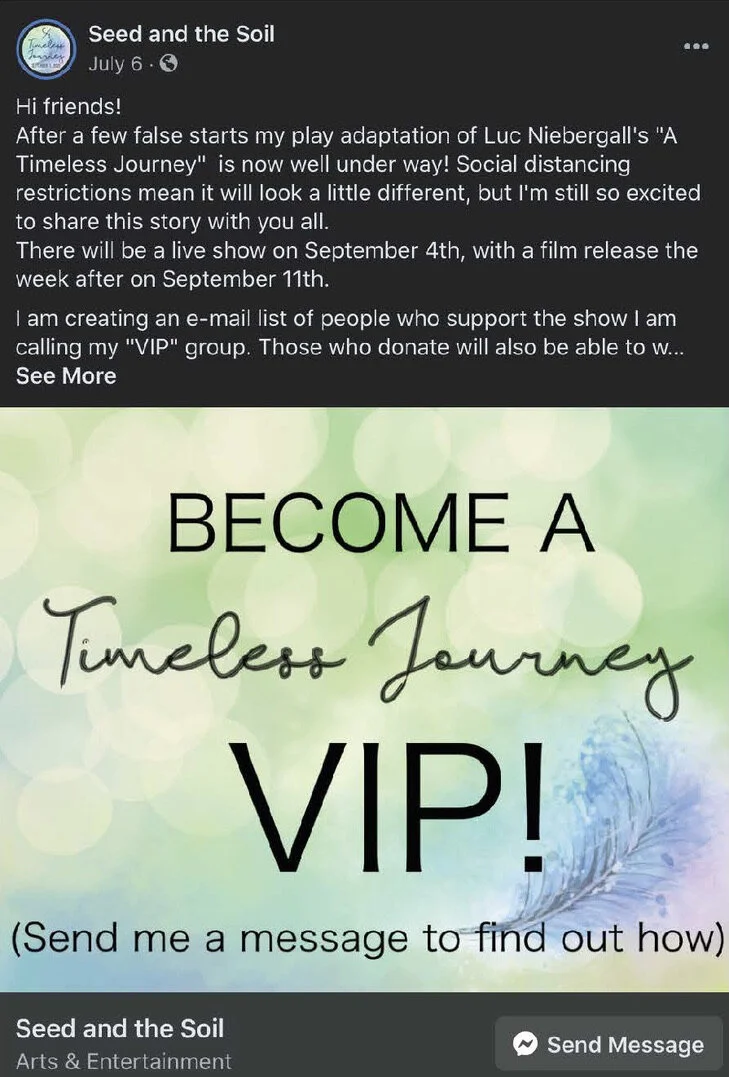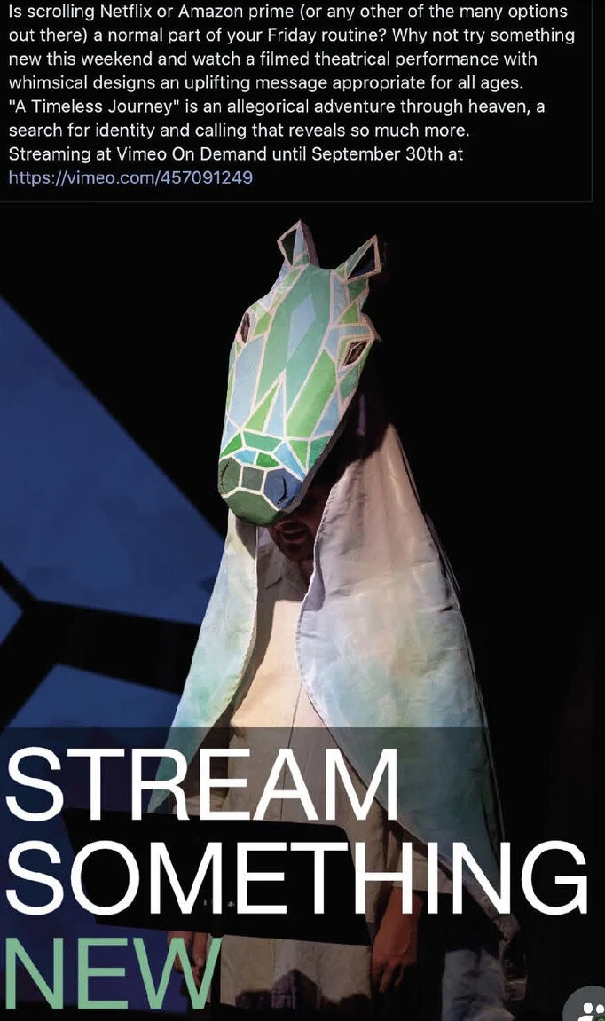 PLOT SUMMARY: “A Timeless Journey” was an adaptation from a book by a local Calgary author named Luc Niebergall. The book is his semi-biographical retelling of a collection of visions that he had of heaven, the play adaptation made this a single unified dream. The protagonist wakes up on the shores of heaven without a recollection of who they are - they are then given “orders” from God to take a mysterious child to the Tree of Life and begin their adventure through heaven. While on their mission, Nameless encounters historical figures and meets God in all forms, learning more about themselves and their loving father.